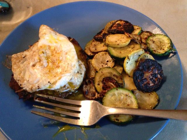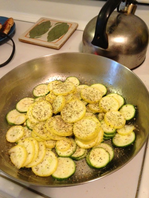 Throw the zucchini and squash rounds in the pan and cover with the spices. Cover the pan and allow the veggies to cook, stirring occasionally. About 5-ish minutes. Usually while this is happening I’m doing dishes.