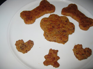 Cut out shapes with cookie cutters and place them on your sprayed cookie sheet. These don’t spread out much so you can put them closer together than you would cookie dough. Bake at 350 for 25-40 minutes, depending on the size of the treats. I usually check them at about 15 minutes and flip them over so they brown evenly on both sides.