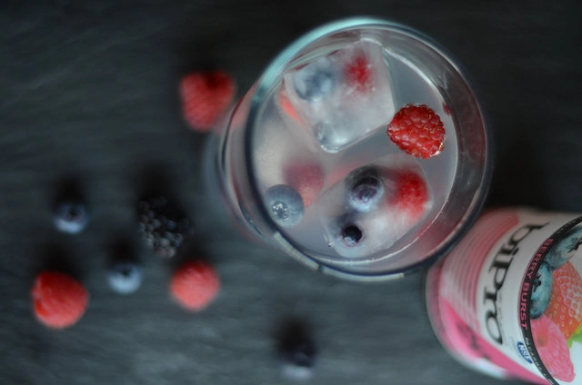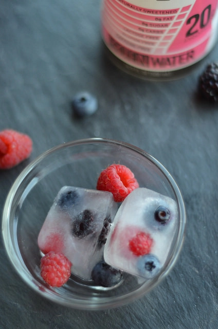 I wish I’d taken pics of my process of making these (I have no excuse why I didn’t except that I didn’t), but I feel like you guys know how ice cube prep goes. The only thing that I did differently was to plop a few berries (in this case, blueberries, blackberries and raspberries) into the ice cube tray before adding the BiPro Berry Burst Protein Water, and popping those suckers in the freezer.