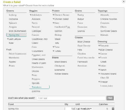 I happened upon them accidentally. I ate a salad for the first time after starting to use the service and I went to log it and an option came up that said “Create a Salad.” Being the adventurous person that I am, I clicked it. And this menu comes up. With damn near every item one could put in a salad listed.
