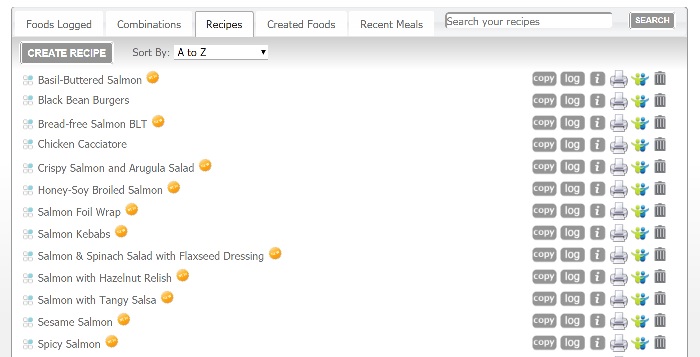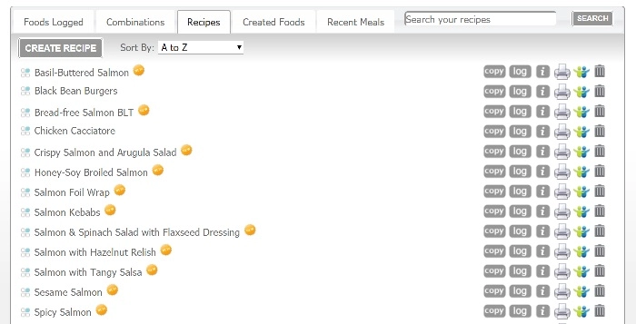After talking about what food I had in the house, she helped me start to etch out a plan to follow. Like…an actual meal plan. Like…”Try making this, this and this to eat for the week…” Yeah. That. At the same time I had come into a decent quantity of salmon I didn’t want to go to waste, but I really only know four ways to cook salmon and they were all…blah. So you know what she did? She made a collection of recipes for salmon and placed them in my food tracker. Lookit: