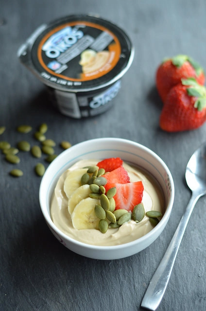 So for the second bowl I decided to get a little adventurous (plus by this time I had completely emptied my baking cabinet, which is where I keep the kind of mix-ins perfect for this kind of food-play) and went with 4-ish oz. of the peanut butter yogurt, with 3 slices of banana, 1 sliced strawberry and a teaspoon of pepitas (roasted pumpkin seeds). I didn’t like Oikos interpretation of peanut butter flavored, which tasted all kinds of fake, so I added a little bit of powdered peanuts (PB2) to the mix. That made it better. 🙂