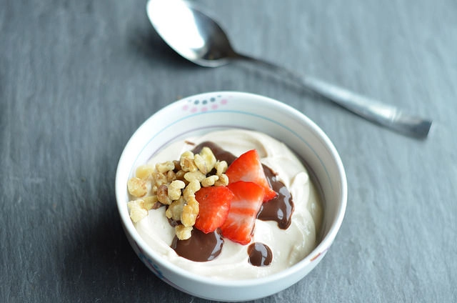 For the first one I kept it simple (in the picture as well as in the bowl!). This is coffee flavored yogurt with sugar-free chocolate sauce (by the way, I’m not a huge fan of that…I only used a teaspoon of it so in the future I’ll just use the regular stuff), strawberries and walnuts. What you see is 4-ish oz. of the yogurt, one sliced strawberry and a teaspoon of chopped walnuts (for those who want to run the numbers).