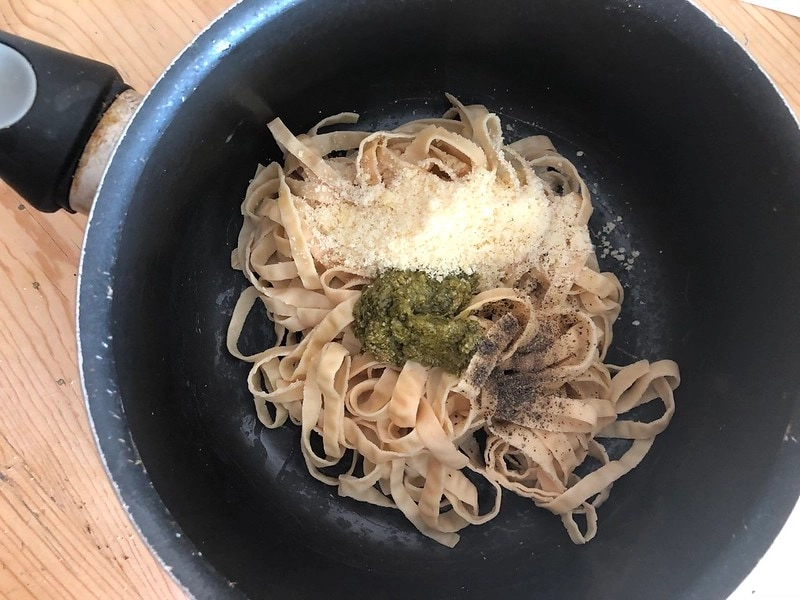 So the good thing about the stats on this product is that you technically don’t really have to add anything to it. I think you should. We’ll get to why in a moment. But you don’t have to. A serving is a legit amount of protein all by itself. For that reason, I decided to keep it simple and just use some pesto sauce I had hanging out in the fridge, along with some extra Parmesan (I put that sh*t on everything!) and some black pepper.