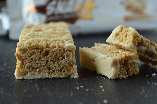 The bars are a manageable size and they do resemble a Rice Krispie treat (or a cereal bar) cut into a rectangular shape. The bars are coated all around: the chocolate peanut butter has a chocolate coating (of course) and the other two have a white coating.