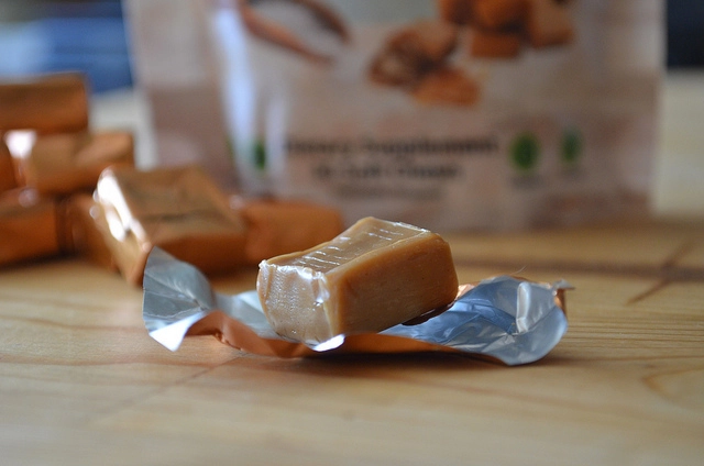 The packaging is all pretty standard fare. The caramels are pretty small, rectangular, and wrapped in a bit of colorful foil. When you open them, you get…a caramel. Now, caramel lovers know that can mean one of a few things, so let me get a bit more specific.