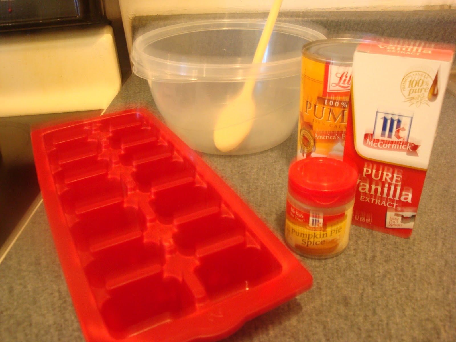 So here we have a can of pumpkin, some pumpkin pie spice, some vanilla extract (or you can use some sugar-free vanilla syrup), a bowl, a wooden spoon and an ice cube tray.