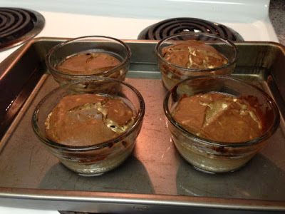 - Place 4 1-cup ramekins (or pampered Chef prep bowls if you are like me) in a baking pan, adding hot tap water to the pan until halfway up the sides of the bowls. Spray ramekins lightly with non-stick spray.
