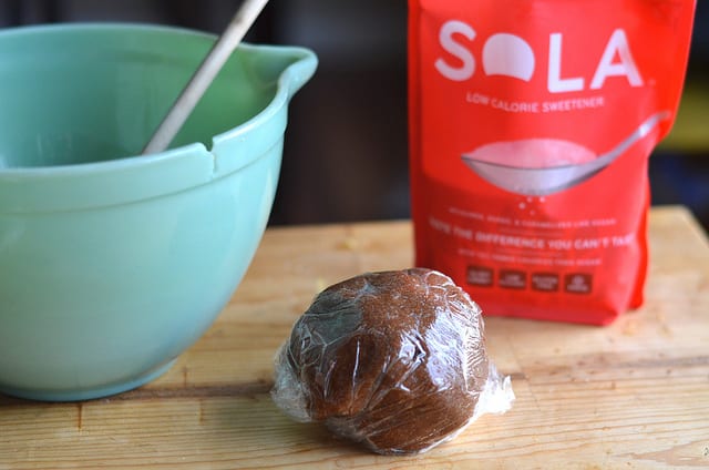 5. Consistency should be of a soft cookie dough. If it is more like cake batter, add an additional tablespoon of almond flour and mixing thoroughly before turning the dough out into plastic wrap. Wrap in a ball and put in the freezer for about 30 minutes.