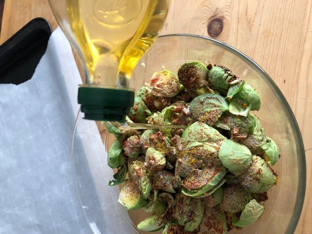 - Add garlic and spices, then oil. Toss until all sprouts are coated.