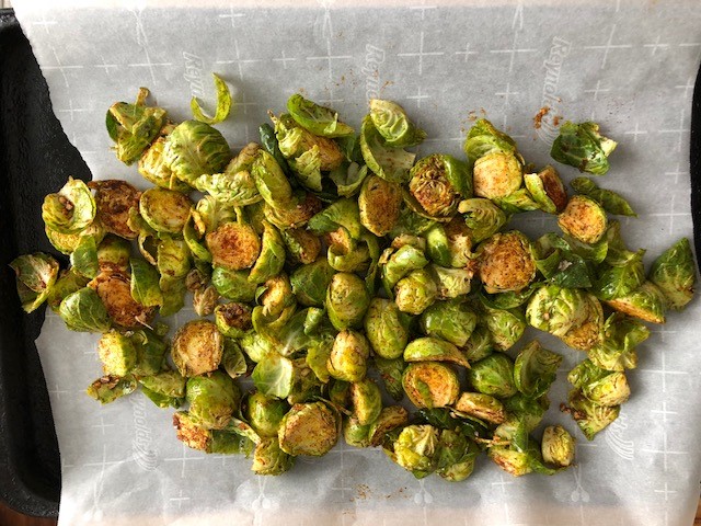 - Line a baking sheet with parchment paper and lay sprouts out in an even layer. Bake for about 20 minutes, or until desired done-ness is achieved (I like mine crispy!)