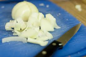 Tonight, just before you’re ready to go to bed, get your Crock Pot out. Now cut up the 3 pounds round or chuck beef steak into 1-inch cubes (unless you found it already cut up into beef for stew at the store). Coarsely chop the large yellow onion.