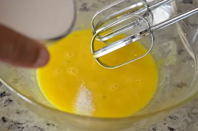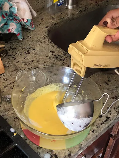 - In a mixing bowl, beat eggs on low with a stand mixer, slowly adding in the sweetener until all is incorporated. Egg yolks should lighten in color and thicken.