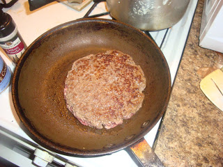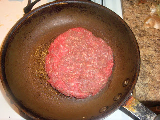In a bowl, mix whatever seasonings you’d normally put into a burger plus the liquid smoke and then form the meat into a big ball. In a sprayed pan, place the ball of meat and then mash into a large patty that looks like this:
