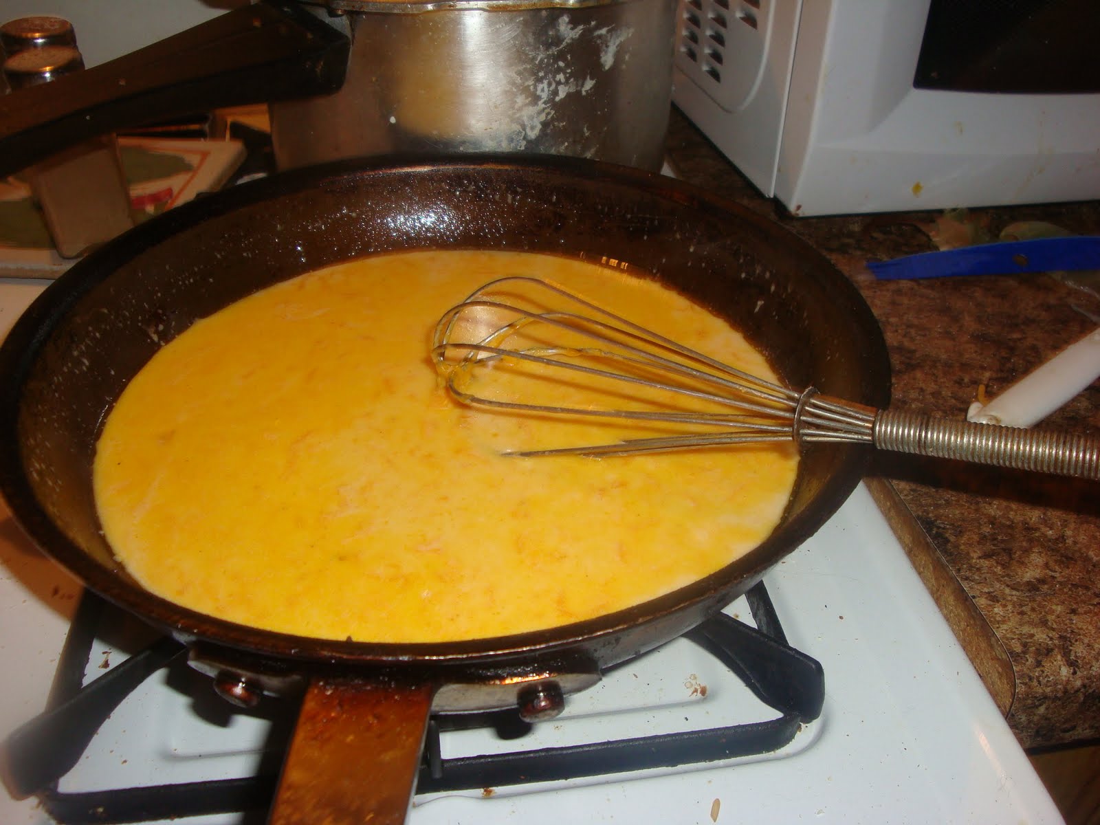 As the sauce is starting to thicken up a bit (it will be thinner than you think it should be), crack two eggs into a bowl. Ladle a little of the cheese mixture out and add it to the eggs about a tablespoon at a time. The eggs should get thicker. Whisk them quickly and put THAT mixture back into the cheese mixture. If you are successful…well you’ve just tempered eggs my friend. Now why did you temper eggs, you may ask? Because the mixture is still too thin and in the interest of this NOT being a complete carb-fest we had to thicken the sauce WITHOUT additional flour. K? If you’re nervous about tempering eggs, you can add a bit of cold water to a tablespoon or two of flour and add it slowly into the mixture. (Edited to add: also if you’ve never tempered eggs before you might want to go the flour route the first time out. But you should know pretty soon into the process if you did it right. If you do it wrong you get egg chunk which is…um…not good…)