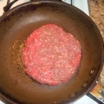 In a bowl, mix whatever seasonings you’d normally put into a burger plus the liquid smoke and then form the meat into a big ball. In a sprayed pan, place the ball of meat and then mash into a large patty that looks like this:
