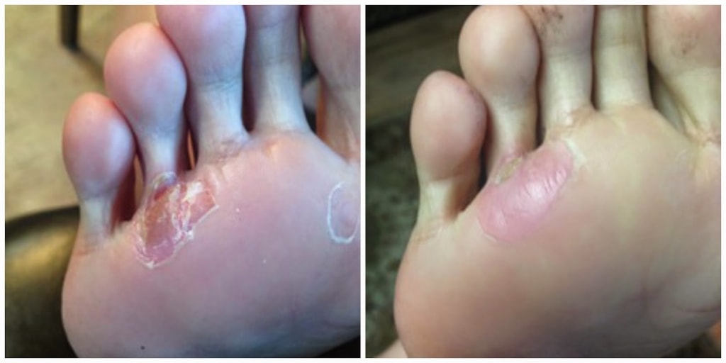 | Left: Post-marathon blister, Right: 48 hours later with use of Squeaky Cheeks |